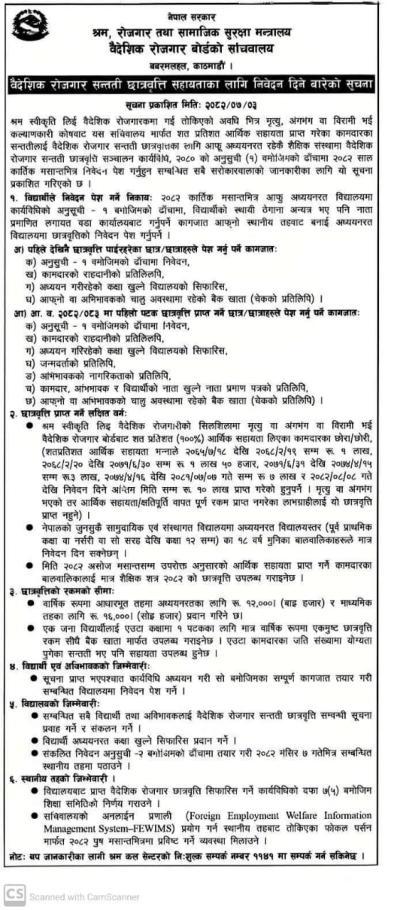 वैदेशिक रोजगार सन्तती छात्रवृति सहायताका लागि निवेदन दिने बारेको सूचना